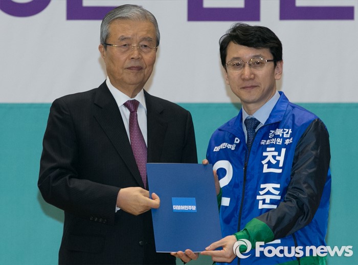 (서울=포커스뉴스) 김종인(왼쪽) 더불어민주당 비대위 대표가 24일 오전 서울 여의도 국회에서 공천장 수여식에 참석해 천준호 서울 강북갑 후보에게 공천장을 전달한 뒤 기념촬영을 하고 있다.