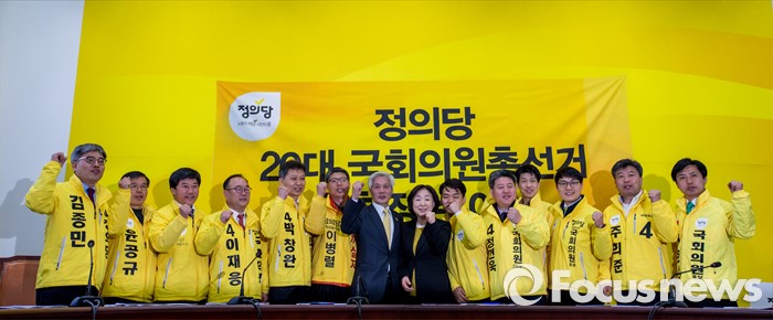 (서울=포커스뉴스) 심상정(오른쪽 일곱 번째) 정의당 상임대표가 24일 오전 서울 영등포구 국회에서 열린 '20대 국회의원총선거 공천장 수여식'에 참석해 김세균(왼쪽 일곱 번째) 정의당 공동대표 및 공천을 받은 후보들과 사진촬영을 하고 있다.