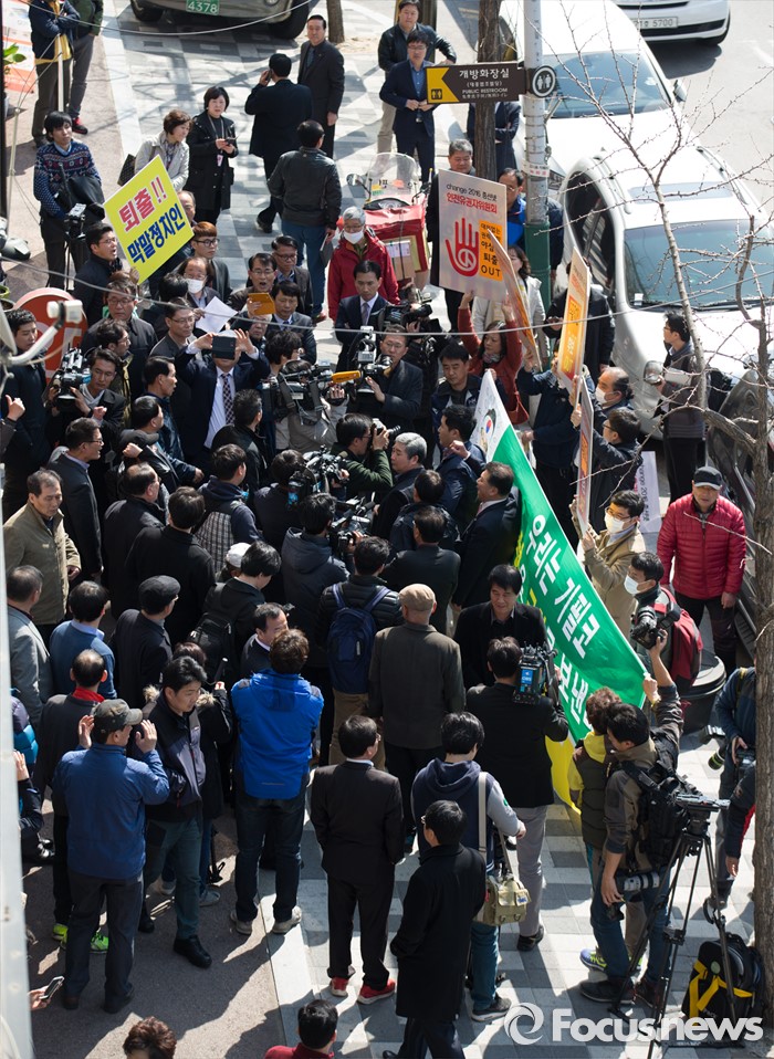 (인천=포커스뉴스) 새누리당을 탈당한 윤상현 의원의 무소속 출마 선언 기자회견이 열린 24일 오전 인천 남구 지역구 사무실 앞에서 2016 체인지 총선네트워크 인천유권자위원회 회원들이 윤상현 의원 출마 규탄 기자회견을 하고 있다.