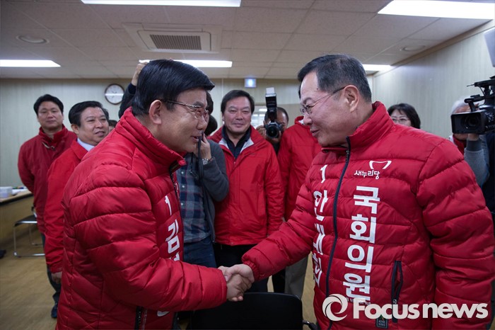 (서울=포커스뉴스) 20대 총선 후보자 등록이 시작된 24일 오전 서울 마포구 선관위에서 안대희(오른쪽) 새누리당 후보와 김성동 후보가 악수하고 있다.