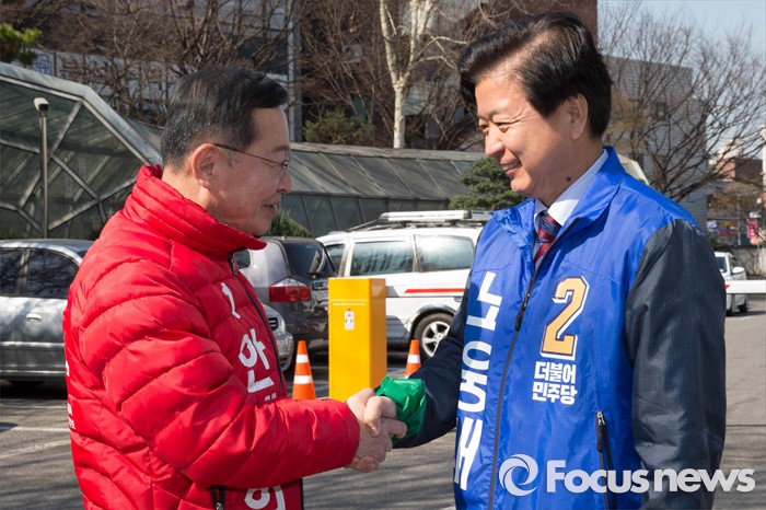 (서울=포커스뉴스) 20대 총선 후보자 등록이 시작된 24일 오전 서울 마포구 선관위에서 안대희(왼쪽) 새누리당 후보와 노웅래 더불어민주당 후보가 악수하고 있다.