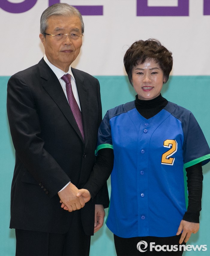 (서울=포커스뉴스) 김종인(왼쪽) 더불어민주당 비대위 대표가 24일 오전 서울 여의도 국회에서 공천장 수여식에 참석해 박옥선 비례대표 후보와 기념촬영을 하고 있다.