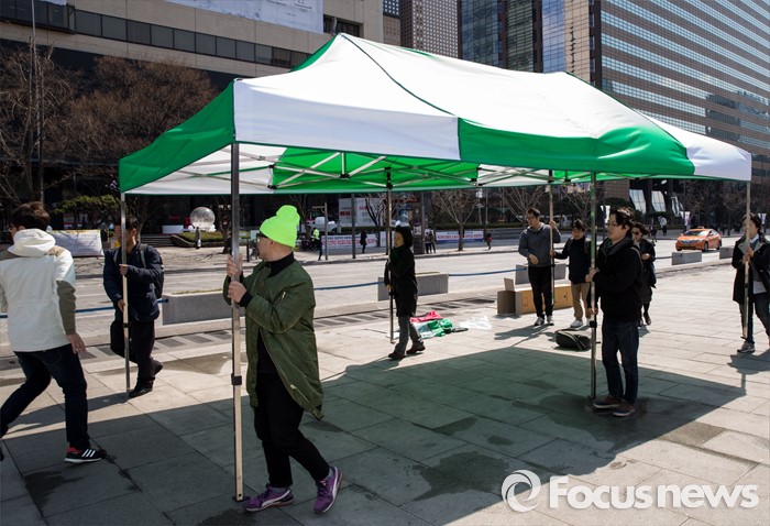 (서울=포커스뉴스) 24일 오전 서울 광화문광장에서 녹색당원들이 천막 선거사무소를 설치하고 있다.