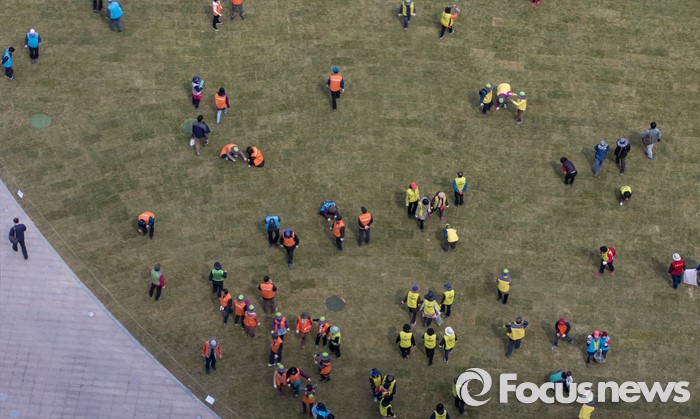 (서울=포커스뉴스) 봄 기운이 완연한 24일 오전 서울광장에서 시민 자원봉사자들이 잔디를 밟아 땅을 다지는 작업을 하고 있다.