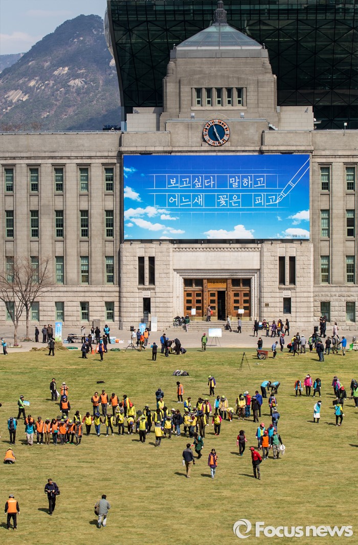 (서울=포커스뉴스) 봄 기운이 완연한 24일 오전 서울광장에서 시민 자원봉사자들이 잔디를 밟아 땅을 다지는 작업을 하고 있다.