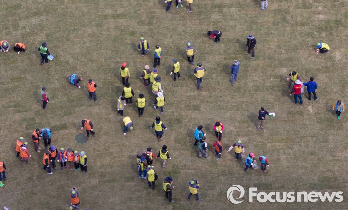 (서울=포커스뉴스) 봄 기운이 완연한 24일 오전 서울광장에서 시민 자원봉사자들이 잔디를 밟아 땅을 다지는 작업을 하고 있다.