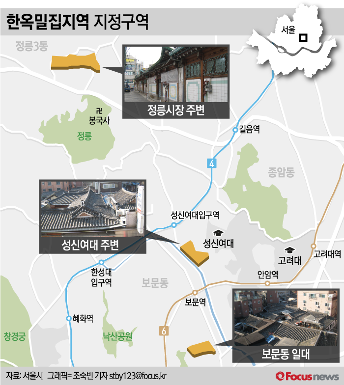 (서울=포커스뉴스) 24일 서울시는 성북구 동선동 성신여대 일대, 정릉시장 주변, 보문동 일대 3개 지역을 한옥밀집지역으로 지정·공고했다.