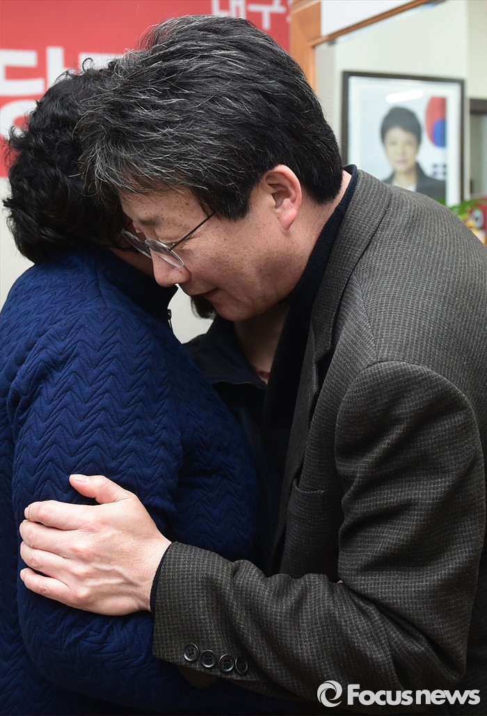 (대구=포커스뉴스) 전날 새누리당 탈당과 함께 무소속 출마를 선언한 대구 동구을 유승민 의원이 24일 오후 대구 동구의 사무소에서 지지자들과 만나 이야기를 나누고 있다.