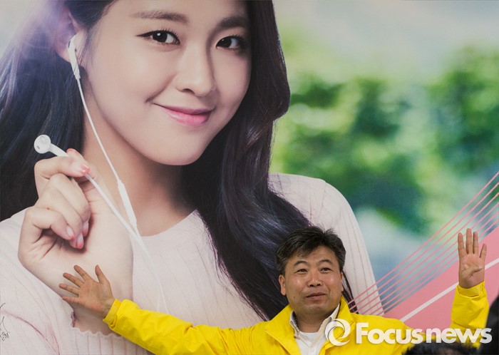 (서울=포커스뉴스) 24일 오후 서울 노원구선거관리위원회를 찾은 주희준 정의당 노원병 후보가 후보자 등록을 마친 후4.13 총선 홍보대사인 설현의 현수막 앞에서 기념촬영을 하고 있다.