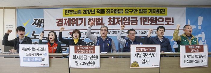 (서울=포커스뉴스) 민주노총(전국민주노동조합총연맹)은 24일 서울 종로구 사무실에서 시급 1만원, 기본 월급 209만원을 핵심으로 하는 '2017년 적용 최저임금 요구안'을 발표했다.