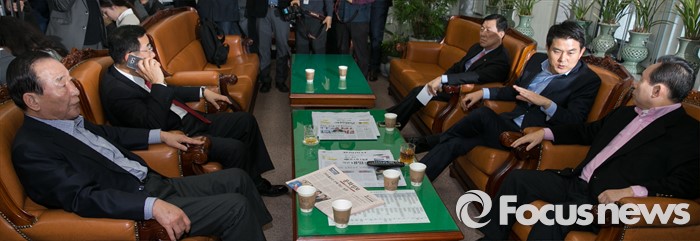 (서울=포커스뉴스) 24일 오후 서울 여의도 국회 새누리당 원내대표실에서 긴급 소집된 최고위원회 간담회를 마친 뒤, 최고위원들이 자리에 앉아 있다. 앞줄 왼쪽 시계방향으로 서청원 최고위원, 김정훈 정책위의장, 황진하 사무총장, 김태호, 이인제 최고위원.