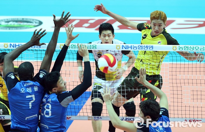 (안산=포커스뉴스) 24일 안산상록수체육관에서 열린 2015-2016 V-리그 남자부 챔피언결정전 4차전 OK저축은행-현대캐피탈 경기에서 OK저축은행 송명근이 현대캐피탈의 3중 블로킹 위로 연타 공격을 한후 볼을 살피고 있다.