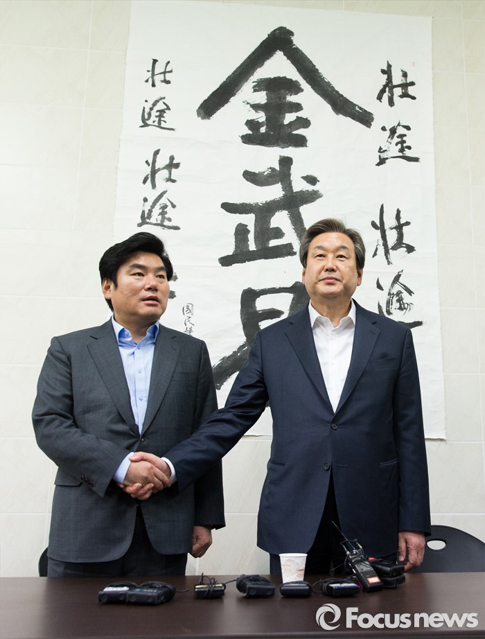 (부산=포커스뉴스) 당 공천관리위원회의 공천안에 반발해 최고위원회의 소집을 거부한 김무성(오른쪽) 새누리당 대표와 설득에 나선 원유철 원내대표가 24일 오후 부산 영도구 김 대표 사무실에서 만나 악수를 나누고 있다.