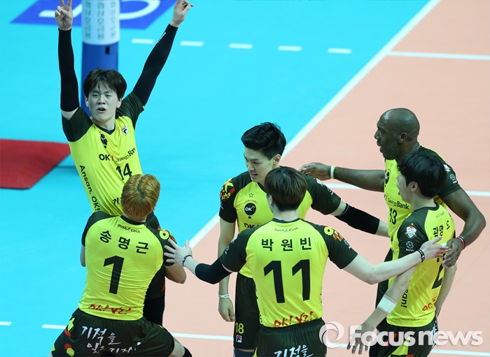 (안산=포커스뉴스) 24일 안산상록수체육관에서 열린 2015-2016 V-리그 남자부 챔피언결정전 4차전 OK저축은행-현대캐피탈 경기에서 OK저축은행 송명근이 블로킹으로 현대캐피탈 문성민의 공격을 막고 득점을 올린 송희채를 안아 올리고 있다.