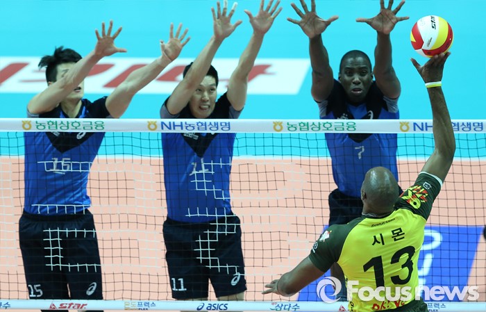 (안산=포커스뉴스) 24일 안산상록수체육관에서 열린 2015-2016 V-리그 남자부 챔피언결정전 4차전 OK저축은행-현대캐피탈 경기에서 OK저축은행 시몬이 현대캐피탈의 3중 블로킹을 보며 연타로 공격하고 있다.