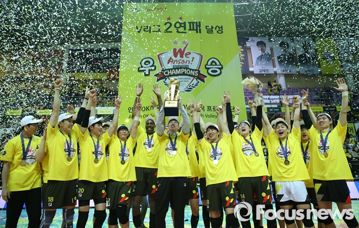 (안산=포커스뉴스) 24일 안산상록수체육관에서 열린 2015-2016 V-리그 남자부 챔피언결정전에서 현대캐피탈을 3승1패로 물리치고 2연패를 달성한 OK저축은행 김세진 감독을 비롯한 선수들이 우승 트로피를 높이 들고 환호하고 있다.