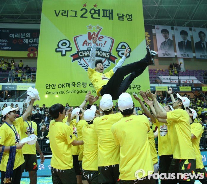 (안산=포커스뉴스) 24일 안산상록수체육관에서 열린 2015-2016 V-리그 남자부 챔피언결정전에서 현대캐피탈을 3승1패로 물리치고 2연패를 달성한 OK저축은행 선수들이 김세진 감독을 헹가래하고 있다.