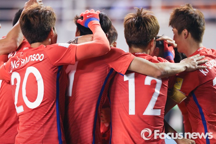 (안산=포커스뉴스) 24일 오후 경기도 안산 와스타디움에서 열린 2018 러시아 월드컵 아시아 2차 예선 7차전 대한민국 대 레바논 경기에서 후반 인저리 타임에 골을 넣은 이정협 선수가 다른 선수들에게 둘러싸여 축하를 받고 있다.