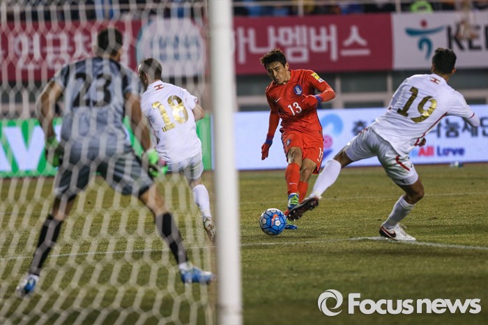 (안산=포커스뉴스) 24일 오후 경기도 안산 와스타디움에서 열린 2018 러시아 월드컵 아시아 2차 예선 7차전 대한민국 대 레바논 경기에서 구자철 선수가 레바논 수비를 뚫고 슈팅을 하고 있다.