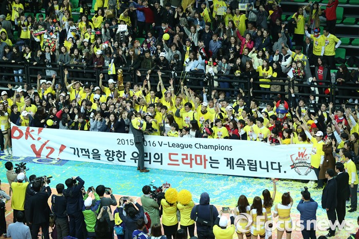 (안산=포커스뉴스) 24일 안산상록수체육관에서 열린 2015-2016 V-리그 남자부 챔피언결정전에서 현대캐피탈을 물리치고 3승1패로 2연패를 달성한 OK저축은행 선수들이 팬들과 함께 기념사진을 찍으며 대미를 장식하고 있다.