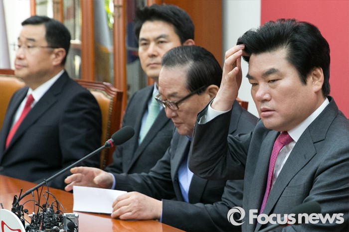 (서울=포커스뉴스) 원유철(오른쪽) 원내대표를 비롯한 새누리당 최고위원들이 25일 오전 서울 여의도 국회 원내대표실에서 열린 최고위원회 간담회에 참석해, 생각에 잠겨 있다.