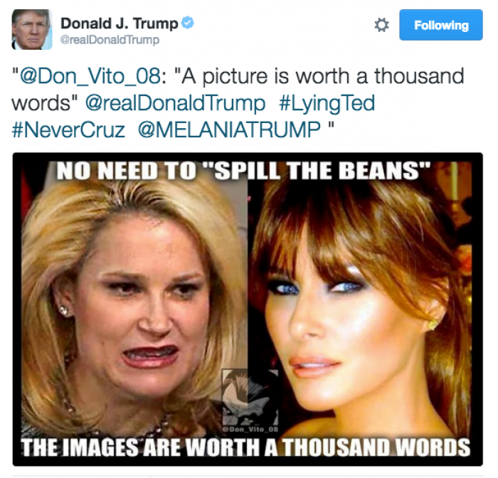위스콘신 주에서 유세 중이던 크루즈는 격노했다. 그는 “하이디를 제발 좀 내버려 두라”고 기자들을 통해 트럼프에게 말했다. 그는 “도널드는 여자와 문제가 있는 모양”이라며 “도널드는 강한 여자를 좋아하지 않는다. 강한 여자는 도널드에게 겁을 준다”고 말했다.<사진출처=트럼프 트위터>