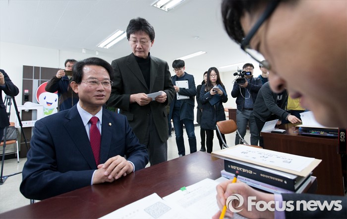 (대구=포커스뉴스) 25일 오전 대구 동구선거관리위원회에서 유승민(오른쪽, 대구 동을) 의원과 류성걸(대구 동갑) 의원이 후보자 등록을 하고 있다.