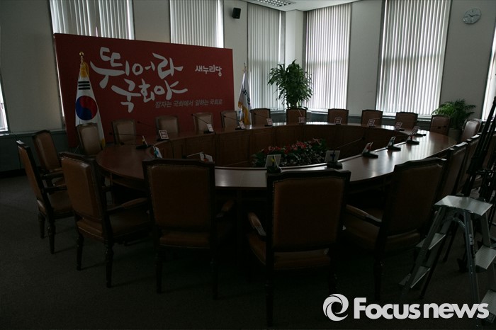 (서울=포커스뉴스) 25일 오전 서울 여의도 국회 새누리당 대표최고위원회의실에 불이 꺼져 있다. 이날 새누리당 최고위원회는 원유철 원내대표를 비롯한 최고위원들의 긴급 최고위원회 소집 요구로 국회 대표최고위원실에서 열릴 예정이었으나, 예정된 시간을 훌쩍 넘겨 당사 회의실에서 비공개로 열리게 되었다.