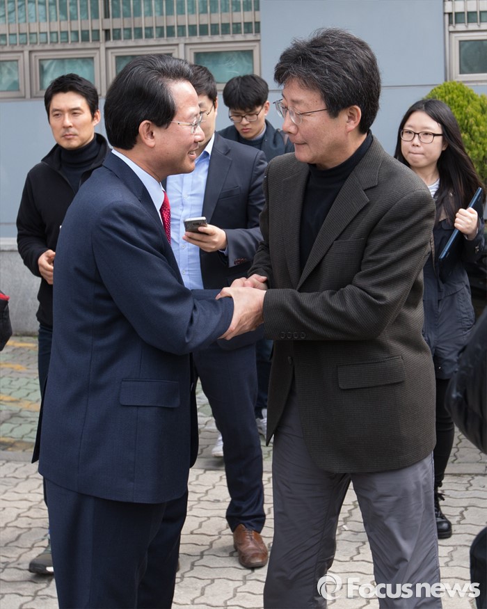 | △ 인사 나누는 유승민과 류성걸 |
