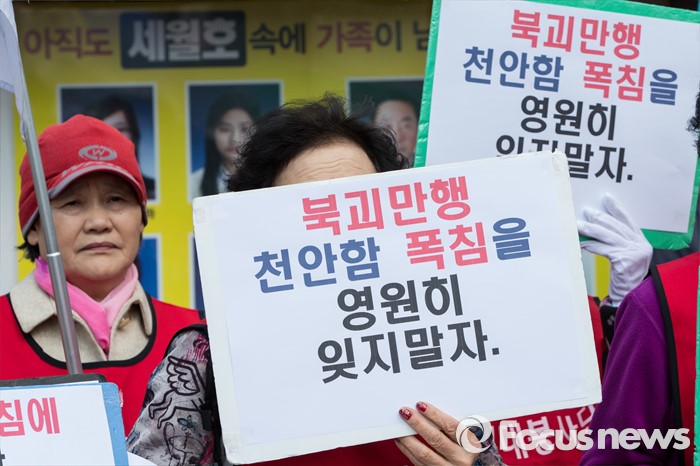 (서울=포커스뉴스) 25일 오전 서울 광화문광장에서 열린 천안함 6주기 추모 및 북한 규탄 기자회견에 참석한 엄마부대봉사단 회원들이 천안함 희생 장병들을 기리는 손팻말을 들고 있다.