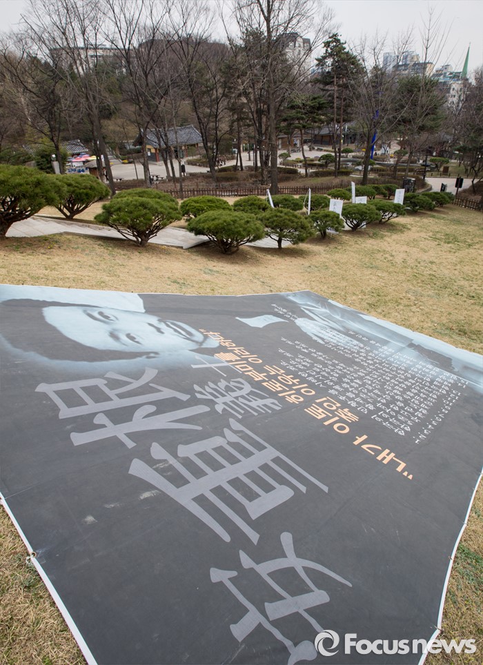 (서울=포커스뉴스) 안중근 의사 순국 106주기를 하루 앞둔 25일 오후 서울 용산구 효창공원 내 삼의사묘역에 마련된 안 의사 허묘 아래로 안중근 의사의 사진이 담긴 대형 현수막이 걸려 있다.