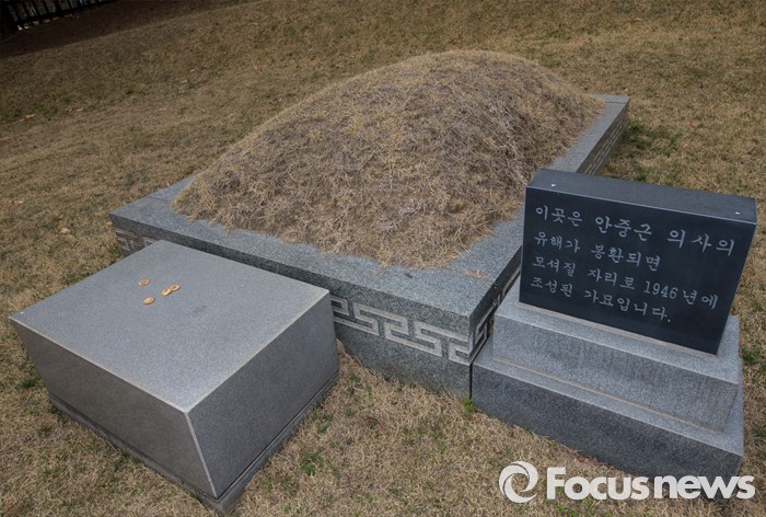 (서울=포커스뉴스) 안중근 의사 순국 106주기를 하루 앞둔 25일 오후 서울 용산구 효창공원 내 삼의사묘역에 마련된 안 의사 허묘.