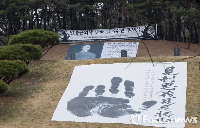 (서울=포커스뉴스) 안중근 의사 순국 106주기를 하루 앞둔 25일 오후 서울 용산구 효창공원 내 삼의사묘역에 마련된 안 의사 허묘 위로 추모식을 알리는 현수막과 안중근 의사의 사진이 걸려 있다. 아래 큰 현수막의 견리사의 견위수명(이익을 보거든 정의를 생각하고 위태로움을 보거든 목숨을 바쳐라)은 안중근 의사가 나라의 앞날을 걱정하며 뤼순 감옥에서 쓴 유묵이다.
