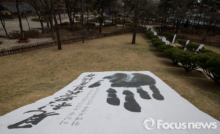 (서울=포커스뉴스) 안중근 의사 순국 106주기를 하루 앞둔 25일 오후 서울 용산구 효창공원 내 삼의사묘역에 마련된 안 의사 허묘 아래로 안 의사의 유묵이 적힌 현수막이 걸려 있다.큰 현수막의 견리사의 견위수명(이익을 보거든 정의를 생각하고 위태로움을 보거든 목숨을 바쳐라)은 안중근 의사가 나라의 앞날을 걱정하며 뤼순 감옥에서 쓴 글귀다.