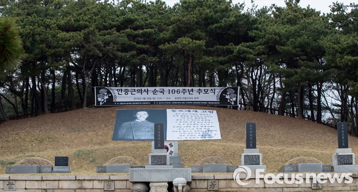 (서울=포커스뉴스) 안중근 의사 순국 106주기를 하루 앞둔 25일 오후 서울 용산구 효창공원 내 삼의사묘역에 마련된 안 의사 허묘 위로 추모식을 알리는 현수막과 사진이 걸려 있다. 옆으로 왼쪽 두 번째 부터 이봉창, 윤봉길, 백정기 의사의 묘.