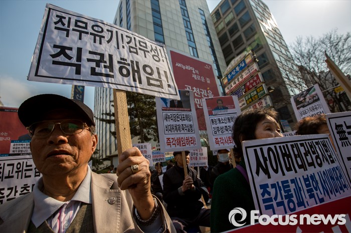 (서울=포커스뉴스) 새누리당이 최고위원회의를 열어 의결이 보류된 5개 지역구에 대한 추인 문제를 논의하고 있는 25일 오후 서울 영등포구 새누리당사 앞에서 어버이연합 관계자들이 '옥새투쟁'을 이어가고 있는 김무성 새누리당 대표의 행동을 규탄 하고 있다.
