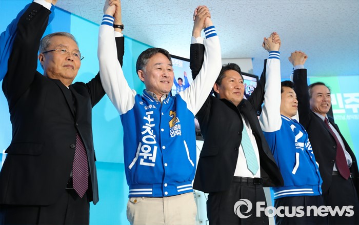 (용인=포커스뉴스) 김종인 더불어민주당 비대위 대표가 25일 오후 경기도 용인시 표창원 후보 선거사무소 개소식에 참석해 표 후보 등 내빈들과 함께 손을 들고 있다. 왼쪽부터 김 대표, 표 후보, 정청래 의원, 김병관 경기 성남분당갑 후보, 주진형 총선정책공약단 부단장.