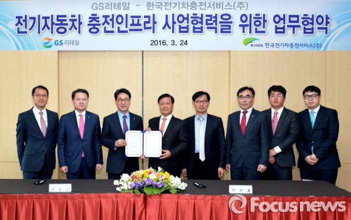 한국충전은 지난해 8월31일 전기차 유료충전서비스 제공을 목적으로 한국전력·현대기아차· KT·비긴스·제주스마트그리드협동조합이 출자해 설립한 회사다.3월24일 조윤성 GS리테일 편의점 사업부 대표(왼쪽 3번째), 박규호 한국 전기차 충전서비스 주식회사 대표(왼쪽 4번째)와 양사의 임직원이 업무협약 체결 후 기념촬영을 하고 있다.<사진제공=GS리테일>