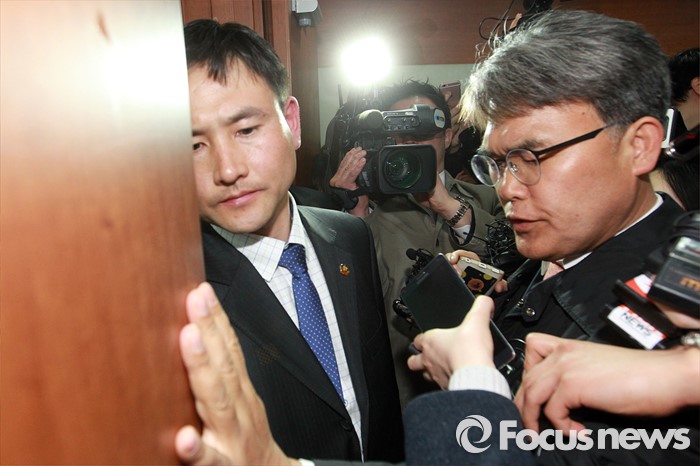 (서울=포커스뉴스) 이재만(오른쪽) 새누리당 대구 동을 예비후보가 25일 오후 서울 여의도 당사 회의장 입구에서 최고위원회의 무공천 결정에 대해 항의하며 면담을 요청하고 있다. 이날 새누리당 최고위는 정종섭(대구 동갑), 추경호(대구 달성), 이인선(대구 수성을) 후보의 공천을 확정했으며, 유영하(서울 송파을), 이재만(대구 동을), 유재길(서울 은평을) 후보는 공천 의결 보류를 확정했다.