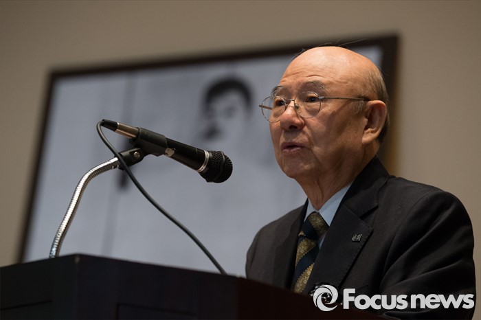 (서울=포커스뉴스) 26일 오전 서울 중구 안중근의사기념관에서 열린 '안중근의사 순국 106주기 추모식'에서 안응모 안중근의사숭모회 이사장이 추모식사를 하고 있다.