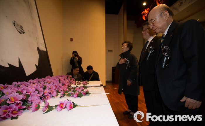 (서울=포커스뉴스) 26일 오전 서울 중구 안중근의사기념관에서 열린 '안중근의사 순국 106주기 추모식'에서 참석자들이 헌화 후 묵념을 하고 있다.