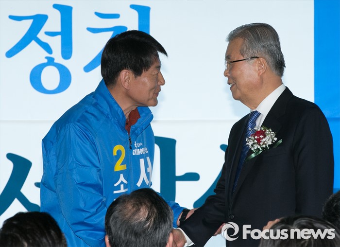 (무안=포커스뉴스) 26일 오후 전남 무안군에서 열린 서삼석 더불어민주당 전남 영암·무안·신안군 후보 선거사무소 개소식에 참석한 김종인(오른쪽) 비대위 대표가 떠나기 앞서 서 후보와 악수하고 있다.