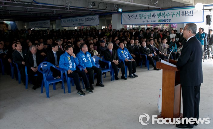 (무안=포커스뉴스) 26일 오후 전남 무안군에서 열린 서삼석 더불어민주당 전남 영암·무안·신안군 후보 선거사무소 개소식에 참석한 김종인 비대위 대표가 축사를 하고 있다.