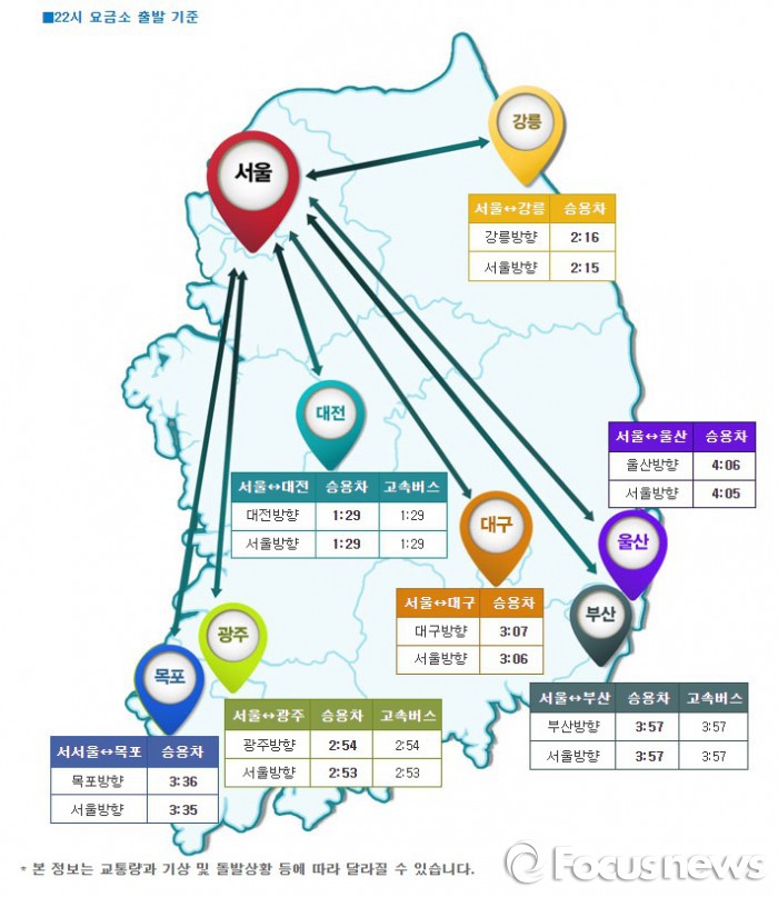 도로공사 관계자는 “서해안고속도로 서울 진입 방향으로 일부 정체가 있으나 빠른 속도로 풀리고 있어 전 구간 통행 원활하다”고 밝혔다.26일 오후 10시 기준 주요 도시 간 예상 소요시간.<사진제공=한국도로공사>