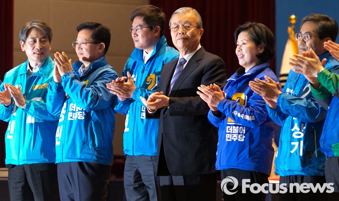 (광주=포커스뉴스) 김종인(왼쪽 네번째) 더불어민주당 비대위 대표가 27일 오전 광주 서구 김대중컨벤션센터에서 더불어민주당 경제살리기 광주·전남 20대 총선 후보자 연석회의를 마친 뒤 후보들과 함께 박수치고 있다.