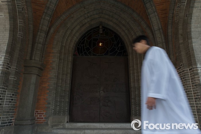 (서울=포커스뉴스) 부활절을 맞아 27일 정오 서울 중구 명동성당에서 사제들이 '예수 부활 대축일 미사' 준비로 바삐 움직이고 있다.