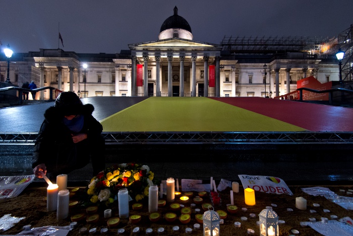 지난 3월 24일 영국 런던 트래펄가 광장에서 브뤼셀 테러 희생자들을 추모하는 촛불이 불을 밝히고 있다