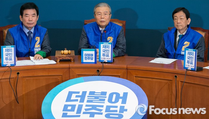 (서울=포커스뉴스) 김종인 더불어민주당 비대위 대표 겸 선대위원장이 27일 오전 서울 여의도 국회에서 중앙선거대책위원장단회의에 앞서 재외선거 독려 발언을 하고 있다. 왼쪽부터 김진표 부위원장, 김 위원장, 진영 부위원장.