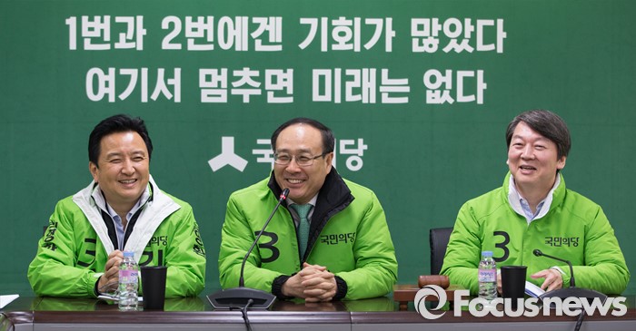 (서울=포커스뉴스) 안철수 국민의당 상임공동대표(오른쪽)와 오세정 공동선거대책위원장(가운데), 김영환 선거대책위원장이 28일 서울 마포구 당사에서 열린 선거대책위원회의에 참석하고 있다.