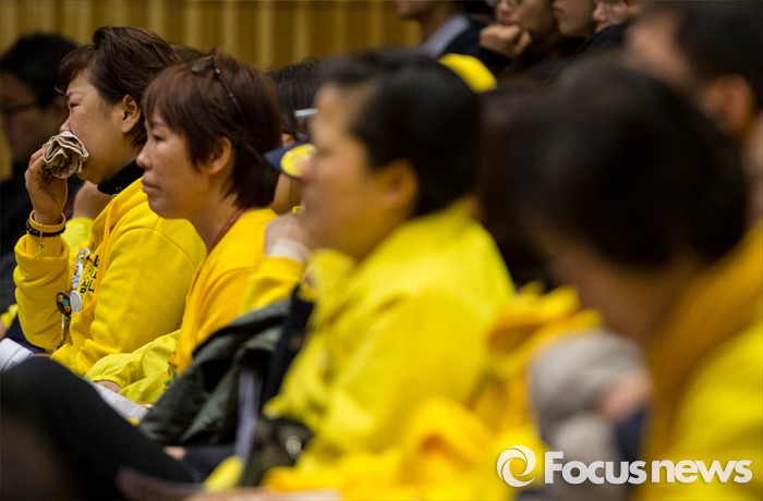 (서울=포커스뉴스) 28일 오전 서울시청 다목적홀에서 세월호 참사 특별조사위원회의 제2차 청문회가 열렸다. 이날 청문회에 참석한 세월호 참사 유가족들이 사고 영상을 시청 중 눈물을 흘리고 있다.